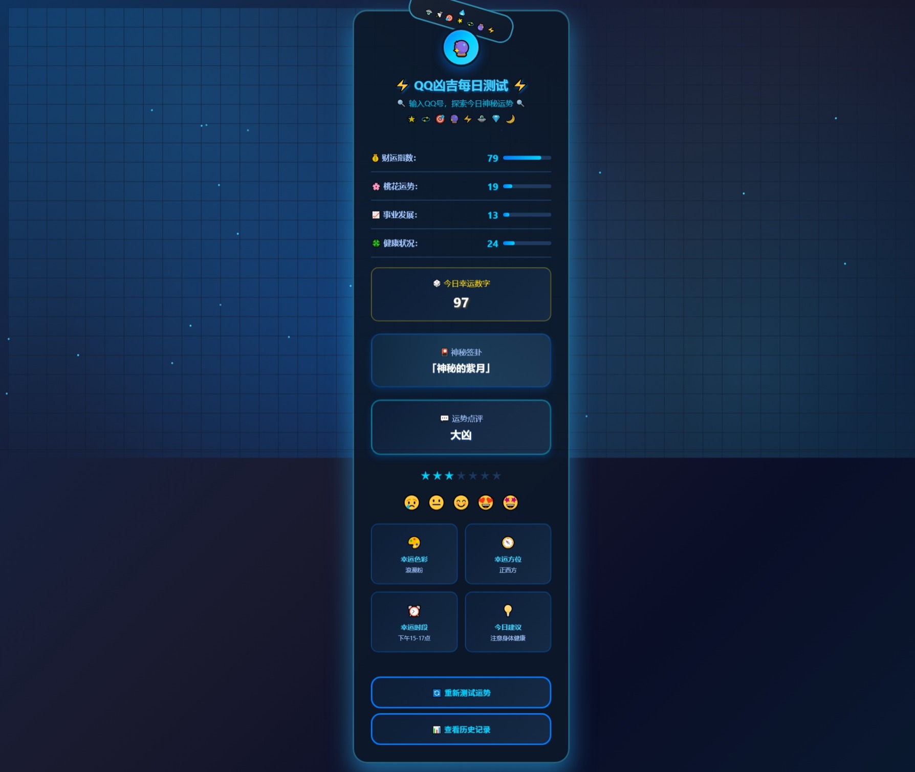 • 三大运势指标:财运、桃花运、事业运数值评分(1-100分)