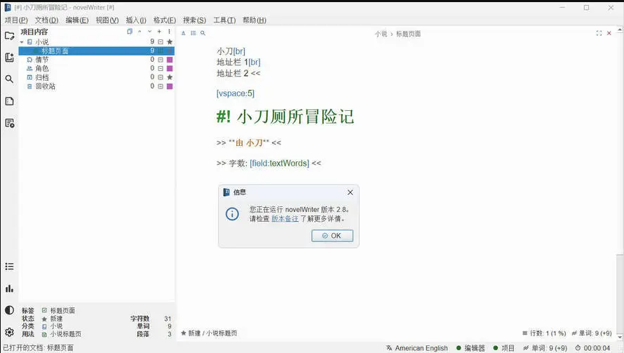 novelWriter 中文版是一款功能强大、易于使用的开源小说创作工具,它结合了 Web 应用程序和命令行工具,让写作过程变得更加高效、有序且富有乐趣。通过其强大的功能特点和跨平台支持,novelWriter 成为小说创作者不可或缺的工具之一。如果您是一位小说创作者,那么 novelWriter 值得您去尝试。