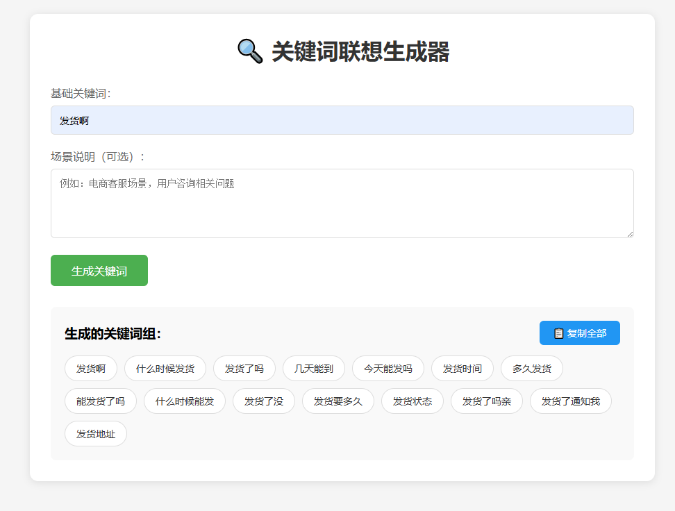 输入一个词可以调用ai大模型的api进行联想分析给出同类型词组,方便填充客服问答知识库使用 也可自定义问答模板进行特定生成
