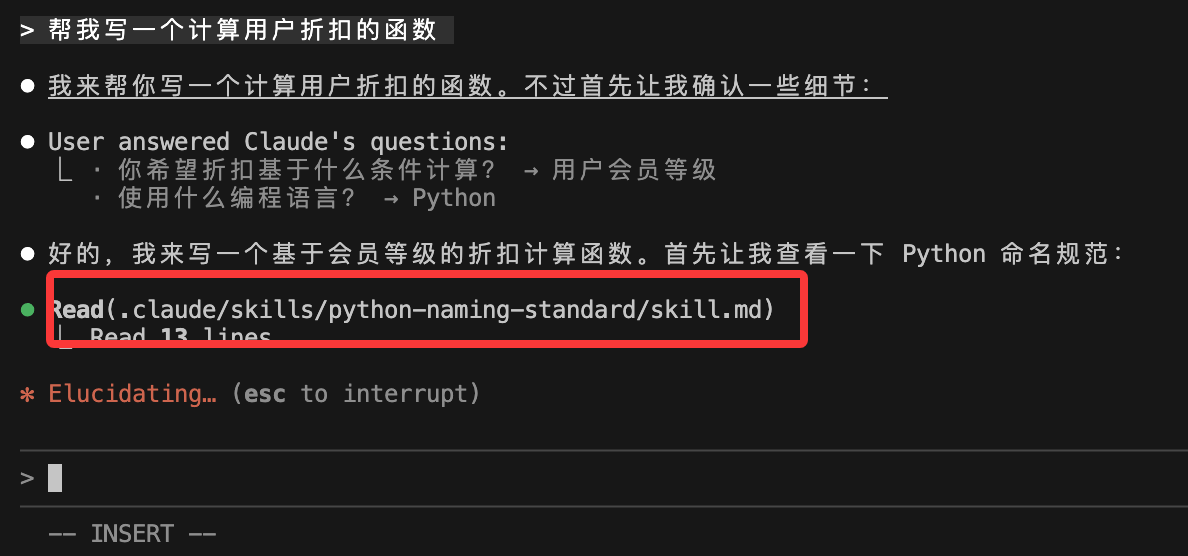 Claude 就会会扫描已安装的 Skills,发现你的请求涉及 “Python 代码编写”,匹配了 python-naming-standard。