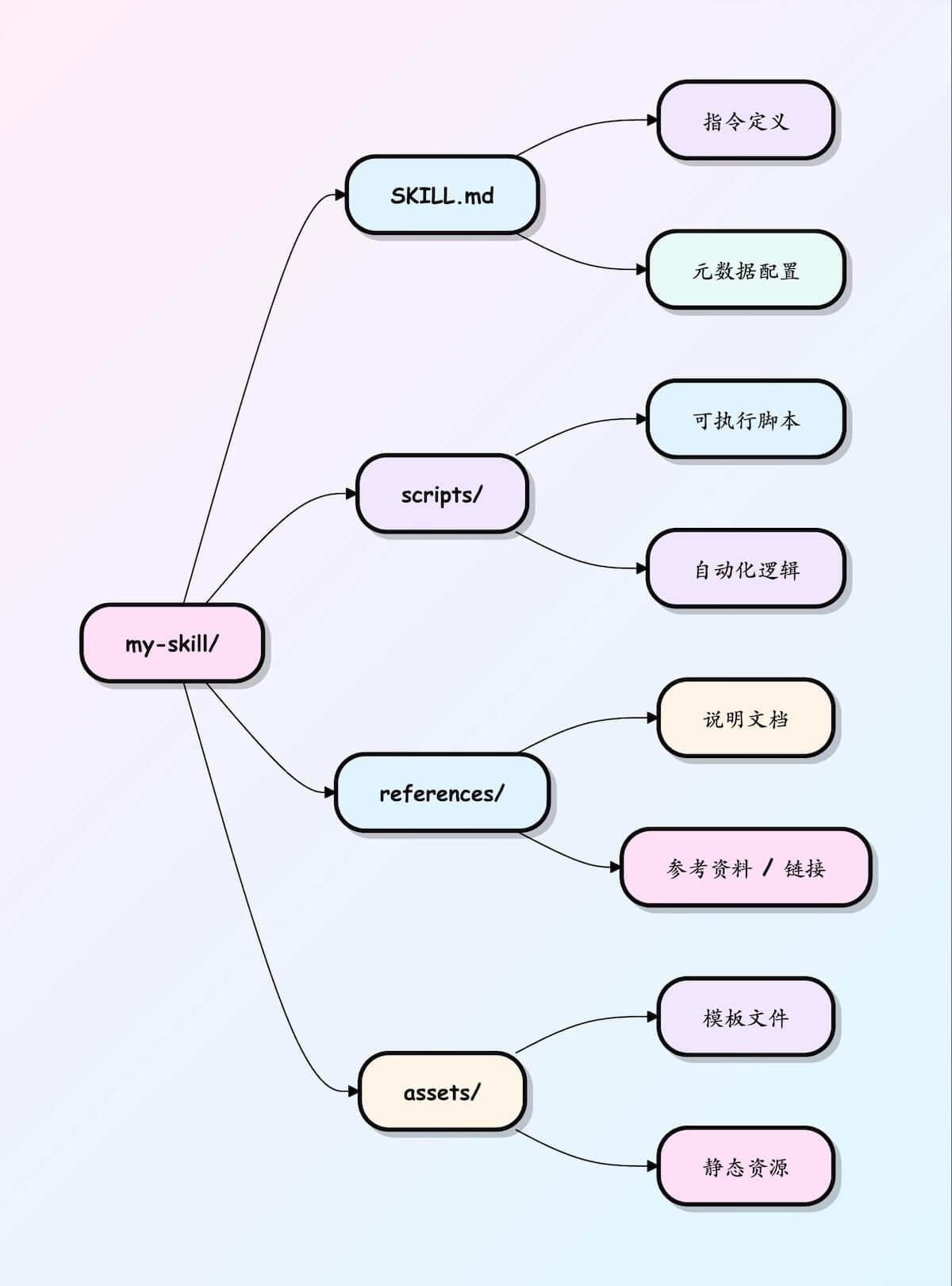 my-skill/ ├── SKILL.md # 必需:指令 + 元数据 ├── scripts/ # 可选:可执行代码 ├── references/ # 可选:文档资料 └── assets/ # 可选:模板、资源