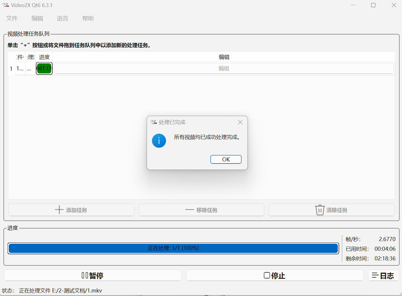- 点击【开始】按钮,软件会自动处理并生成新的视频文件。