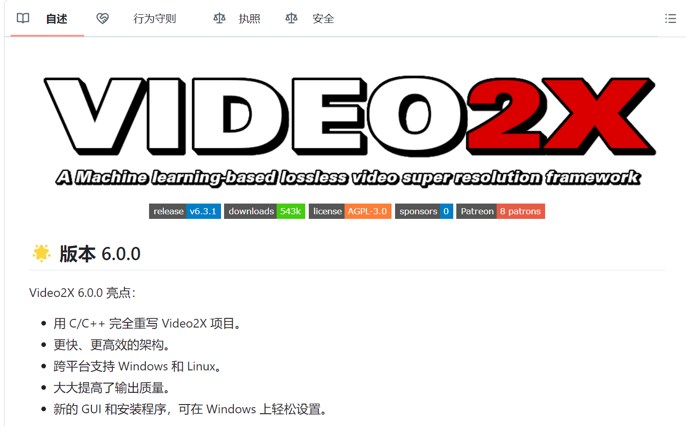 Video2X 是一款基于深度学习技术开发的开源视频处理工具,能够通过超分辨率和帧插值技术,将低画质视频无损放大至更高分辨率,如 4K 甚至 8K。