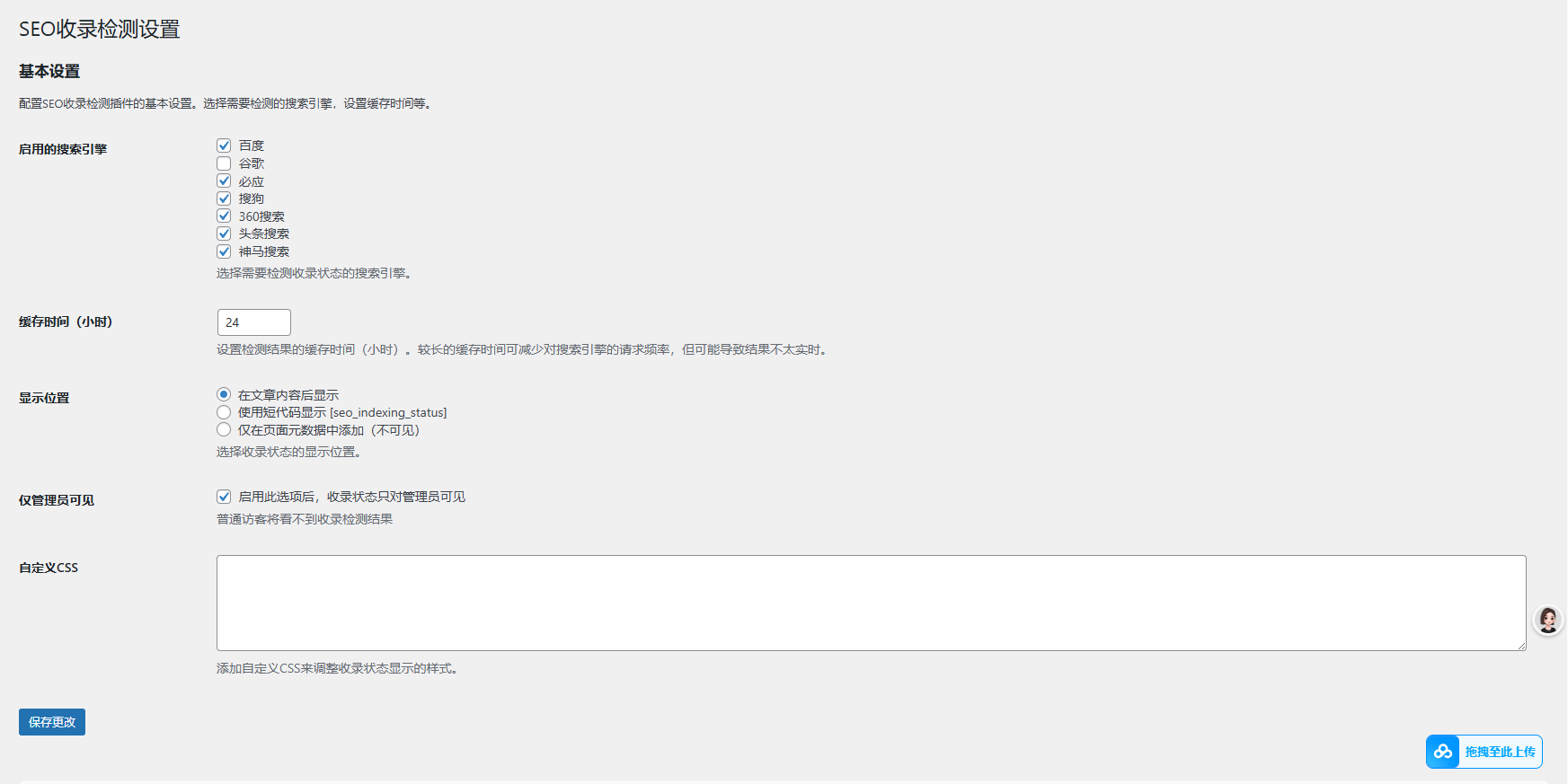 系统要求包括PHP7.0及以上版本、WordPress4.6及以上版本、服务器支持cURL扩展,并需稳定的网络连接。用户可通过 WordPress后台或FTP方式安装。基本配置包括选择检测的搜索引擎、设置缓存时间、选择展示位置、管理管理员权限,并可自定义样式。